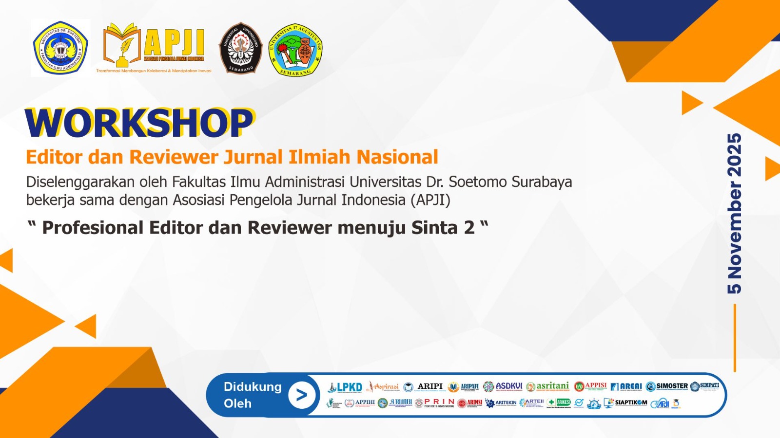 Workshop ini menghadirkan pemateri dari kalangan pakar publikasi ilmiah, pengelola jurnal bereputasi, serta asesor SINTA yang berpengalaman dalam penjaminan mutu jurnal ilmiah. Materi yang dibahas meliputi pemahaman mendalam mengenai standar penilaian SINTA 2, strategi peningkatan kualitas artikel, tata kelola editorial yang profesional, teknik melakukan review naskah yang objektif dan beretika, serta penguatan sistem manajemen penerbitan berbasis Open Journal Systems (OJS).